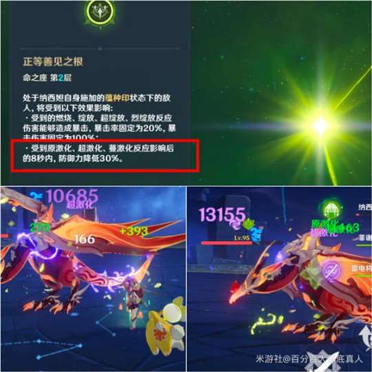 我们分别用瑶瑶挂草(无降防御效果)和二命纳西妲(有降防御效果)来打激化。得到的数值如下图↓