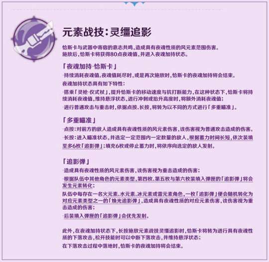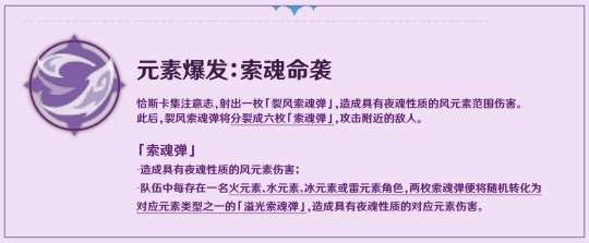 恰斯卡的元素爆发发射形式类似于提纳里,是一个主弹(风)+6发分裂弹(火/水/雷/冰),每有一名火/水/雷/冰角色就能染色2发分裂弹,算是一个补伤害/过渡真空期的技能。