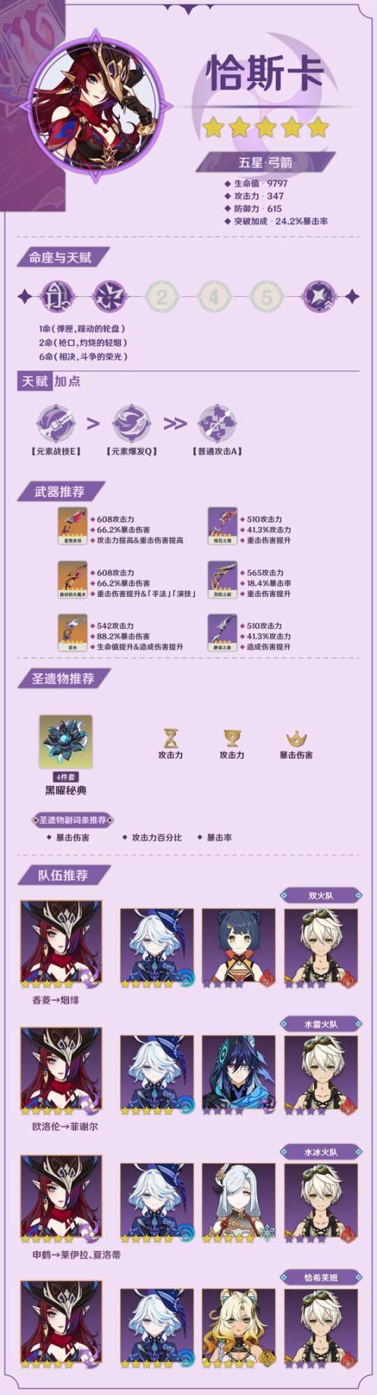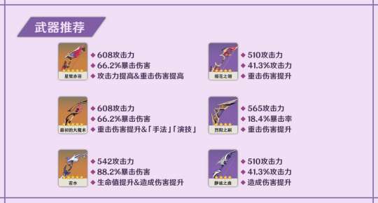 本期武器池中的限定四星弓缀花之翎是最优选择,攻击力副属性没有太大压力,而特殊效果的增伤提升也相当大。月卡武器烈阳之嗣在理论上的攻击力也很不错,但由于需要考虑对单与暴击率副属性的配平,存在一定限制性。