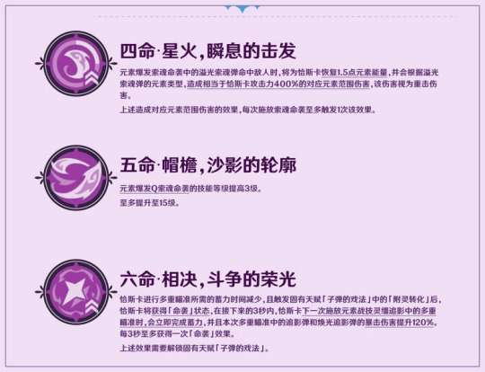 最后接下来是恰斯卡的命座,三命、五命加天赋等级就不赘述了,我们主要看看其他几个命座。