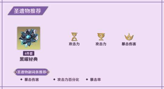 圣遗物的首选是黑曜秘典四件套,因为它能提供15%的普攻重击增伤和40%的暴击率,这些属性都可以轻松被吃满。如果你还没有刷出黑曜套,那么逐影猎人四件套可以作为过渡套装,记得在队伍中携带芙宁娜。逐影猎人四件套提供15%的增伤和36%的暴击率,这个收益也相当不错,和黑曜套仅有一个词条的差距可以忽略不计,实际战斗中几乎没有数值上的区别。除此之外,风套和勇者套也适用于某些特殊情况下的选择,比如队伍中有多个副D并且他们的练度较高。