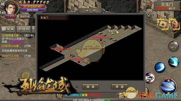 天戈门和海神殿、天下会类似,有多名NPC,并可触发合成破天弓的功能。野外区域有3只boss,击败BOSS可获取神器激活和升阶材料。