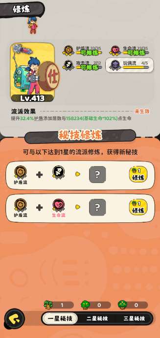 从55关英灵关开始,冒险中会遇见秘技树,有1/2/3星,当两个流派星级都升到对应级别时,点击技能商店旁的秘技按钮即可进行修炼,每种流派每个星级只可使用一次,两个流派每个星级组合都有两个秘技,只能选择其中一个进行修炼。