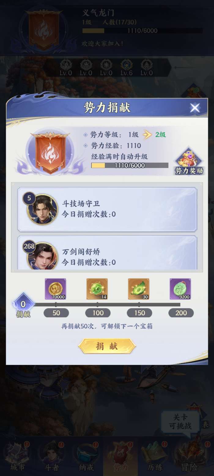 一旦玩家创建势力或者是加入势力之后,他们都会想方设法的让势力壮大在这个时候,每日捐献紫晶。虽然是一个比较小的举动,却能够让视力慢慢的变大变强,因为在斗破苍穹游戏当中,玩家如果累积捐献,达到了指定的次数之后,玩家将会轻松地获取斗气丹、金币等等珍贵的资源,这其实也就验证了付出就会有回报。