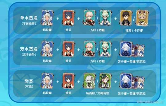 如果你觉得双水队不稳定,但是又不想用草系替代风系,那么你可以考虑换成岩系角色。岩系角色对蒸发反应影响不大,而且可以带贪攀岩套的增伤。攀岩钟离还能提供减抗增伤和护盾。所以单水队可以稳定蒸发,同时还能享受风系聚怪的乐趣,还有钟离提供的安全感。因此,我在单水队下面加了备注,推荐给平民使用。如果没有钟离,可以考虑使用卡齐娜来替代。卡齐娜作为纳塔角色,有夜魂机制,可以搭配勇者套拐增伤。同时作为一个岩系角色,还可以产生结晶。追求极限伤害的旅行者可以使用勇者卡齐娜搭配磐岩或者教官香菱。