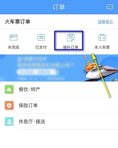 3、在订单页面上找到“候补订单”选项,点击打开候补订单选项页面,