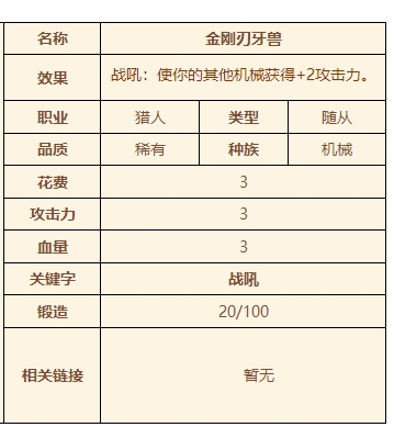 炉石传说金刚刃牙兽获得方法与使用方法,对炉石的了解相当透彻所以我希望大家能够了解一下卡牌单个的特效希望能给大家为大家带来炉石传说猎人的图鉴,主要介绍炉石传说金刚刃牙兽卡牌效果、职业、类型以及属性。