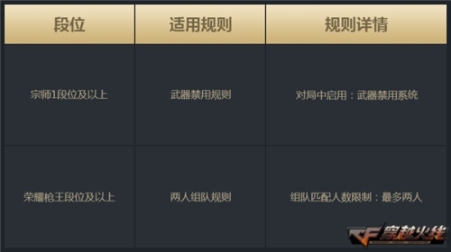 此外,第十四赛季删除了13赛季中新增的“精英爆破模式”,并添加了部分规则至枪王排位第14赛季“爆破模式”中,以增强排位爆破的竞技体验。武器禁用系统中增添了“COP系列、USP系列、M1896系列” 三个副武器枪系,并将禁用武器时的等待时间从30秒缩短至20秒。