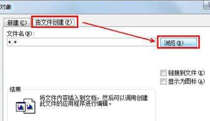 2、在弹出的对象窗口中选择“由文件创建”,点击“浏览”,插入自己需要的CAD图形文件。