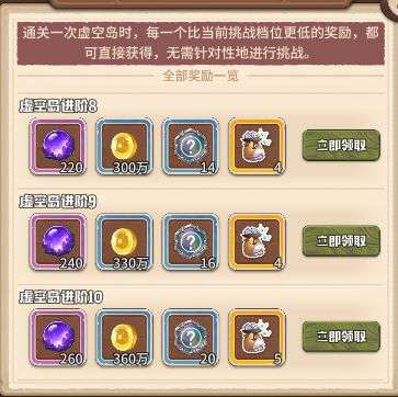 保底奖励共有11份,可以获得大量混沌宝珠、金币、未鉴定宝石等,对应虚空普通到10阶段共11种难度通关,通关一次10阶难度虚空就能领取全部奖励。