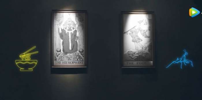 一号密室需要你在牛肉面和螳螂中做出选择。中间有两副壁画,实际是塔罗牌的5号教皇和0号愚者: