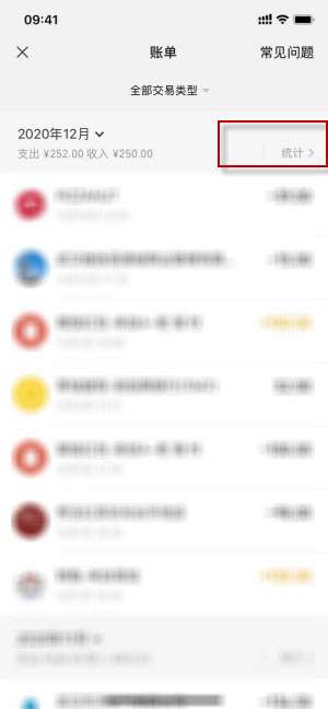 3、进入账单界面后,点击第一排右侧的统计选项,就可以看到年账单的选项了,这里可以看到你2020年的所有收入和支出。