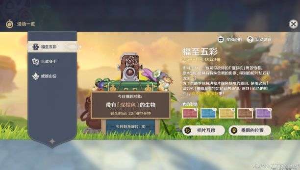 今日福至五彩拍照的内容是棕色生物,首先说一下,今天是生物,采集物是可以采摘、开采的花朵植物、矿物,不是动物、野怪!!!