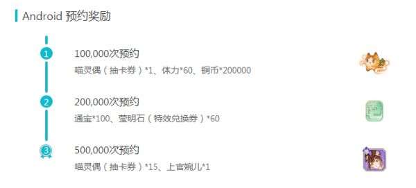 10w次预约:喵灵偶(抽卡券)*1、体力*60、铜币*200000