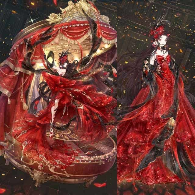 这套套装的设计师是索菲亚,和以往的周年大阁一样,非常华丽,主打色是红色。套装中包含特殊姿势、新的妆容和动态的特效连衣裙、摆件等,并且在集齐套装后可以领取新的换装背景。