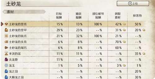 其中通过目标报酬得到的概率为1%,然后捕获的概率为5%,剥取素材的概率为3%,最后掉落下来捡取得到的概率为1%。总的来说算是比较难以得到的一个素材,玩家想要得到只能多刷这个土砂龙了。