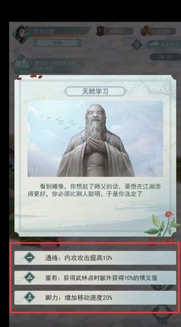 首先是第一个侠道中的功能性建筑——雕像,雕像就是我们天赋学习的主要途径,二测时候我们需要学习轻功跨越特殊地形的时候的需求非常高的一个建筑。只是在公测版本的侠道中并未看到有轻功的学习,但是仍然有脚力(增加在侠道地图中的移动速度),至于富有和通络,相信二测胖友们不会陌生哈。