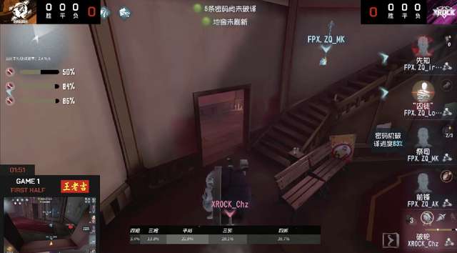 上半场FPX.ZQ战队求生者3出1抓拿到胜利。