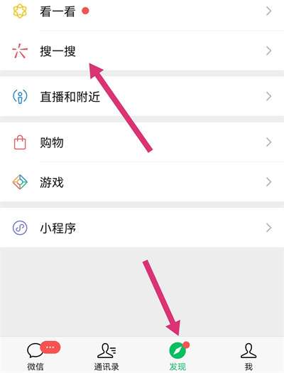 (1)首先登录微信,在“发现”页面中找到“搜一搜”栏目;