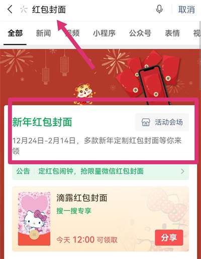 (2)搜一搜点进去后输入“红包封面”字样,然后点击下方“新年红包封面”活动进入,详细时间是2021年12月24日-2022年2月14日;
