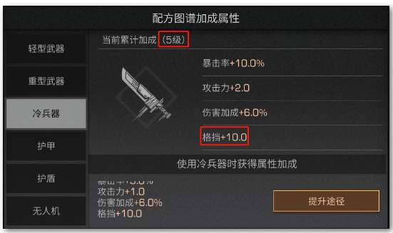1、格挡属性最高的两把刀为锯齿刀和切割之刃,通过配方改造最高可提升至35点,通过配方专研升级至一星可提升15点,即这两把刀的格挡值最高可达50点。