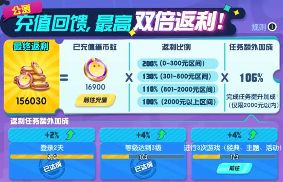 本次“终极测试”期间开放付费充值系统,充值的数额将在公测期间以蛋币的形式返回至同一账号,按照充值蛋币数量区间进行不同比例返还,充值最高返利可达两倍!完成指定任务还可以获得额外返利加成哦!