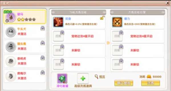 宠物升星需要该宠物的50个宠物碎片进行升星,升星可以大幅度增强宠物的属性,在升到一星、四星、七星、十星可解锁宠物的洗练技能。若对宠物的升星学习的技能不满意,玩家可以通过洗练去更换技能,洗练出自己心仪的技能。洗练需要的净化能量玩家可在宠物商城以及暗狱深渊商城进行购买。