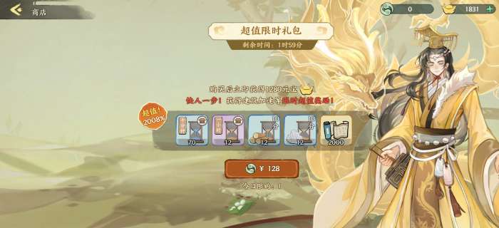 在升级主建筑,初次开放龟甲,钓鱼,瑞兽等情景中有时会触发限时礼包,这种礼包比每日礼包稍微值一点,但预算不多也最好不要买。