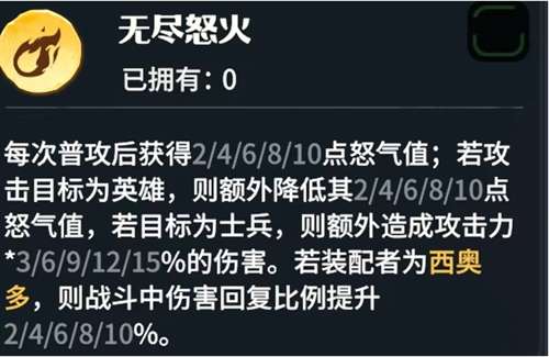 无尽怒火:虽然为西奥多专属,同样比较适配托尔,普通可回怒,可额外造成伤害,能够帮助托尔更快的释放怒气技能和提升范围伤害。