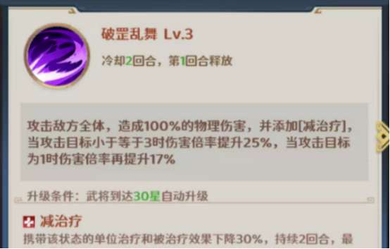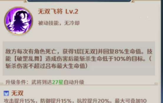吕布这种人物角色有独特的技能组合,尤其是在群体压制或者是持续作战方面表现的特别卓越,破罡乱舞这是与众不同的技能体系,当敌方汹涌来潮的时候,就可以释放出此技能,对群体,敌方会造成全体的100%物理伤害,此外再加上减少治疗的效果会更好,轻而易举就能够将敌方单位快速打败。无双飞将这种独特的技能更是非常卓越,每次击杀一名敌方单位的时候就可以获得一层无双的状态,而每次都可提供最大8%的生命值回复,还可提供15%的攻击力,或者是15%的防御力等。