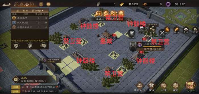 2、占领钟鼓楼,每秒获得2点势力值;还有一个作用是每10秒向洛阳皇城发射箭雨,扣除驻守皇城的敌盟队伍1点血;