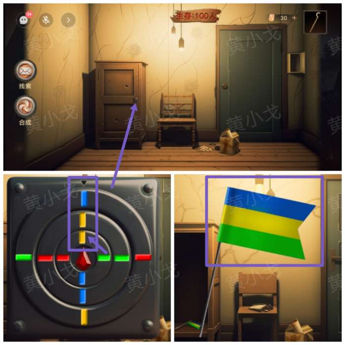 4.点击左侧立柜上的密码锁,根据男主那边旗子的颜色线索,调整密码锁