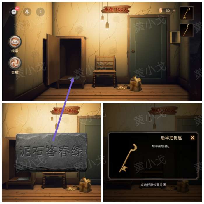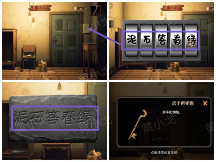 5.点击大门右侧墙上的盒子,根据女主那边的线索,输入密码:泥石答春绿;打开盒子,获得【后半把钥匙】