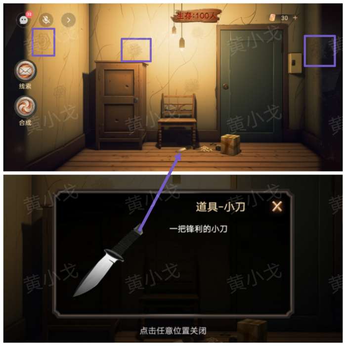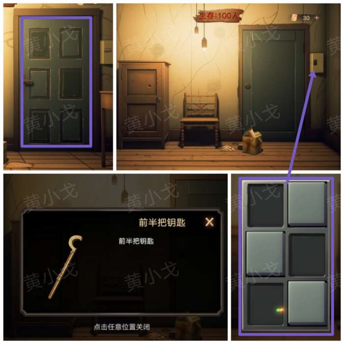 3.点击大门右侧墙上的盒子,根据男主那边的线索,调整格子;打开盒子,获得【前半把钥匙】
