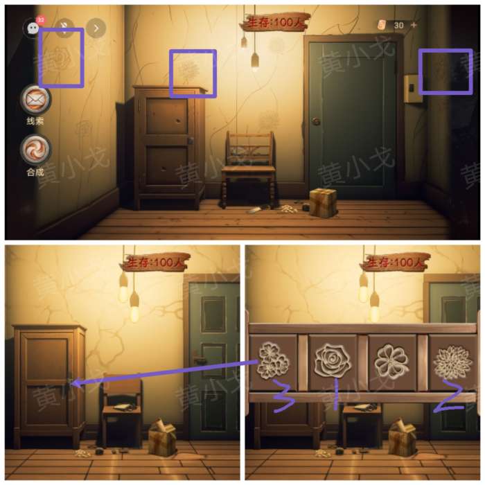 3.点击左侧立柜上的密码锁,根据按钮上花的样式,结合女主那边的线索,按顺序按下按钮
