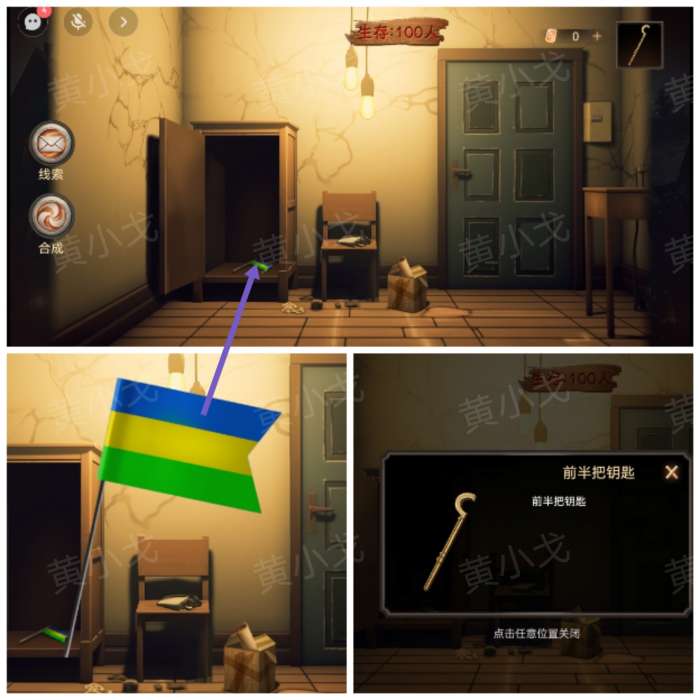 4.打开立柜,获得【前半把钥匙】;查看立柜里的旗子,告诉女主旗子的颜色