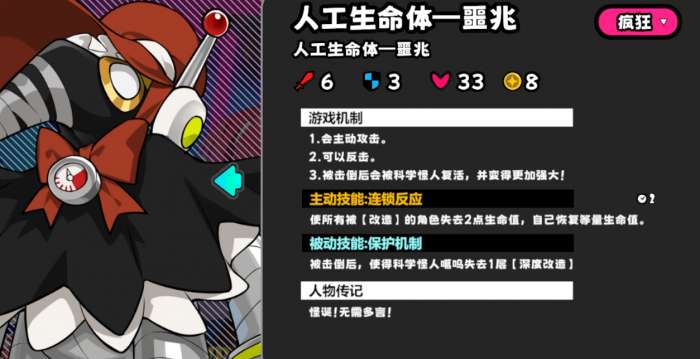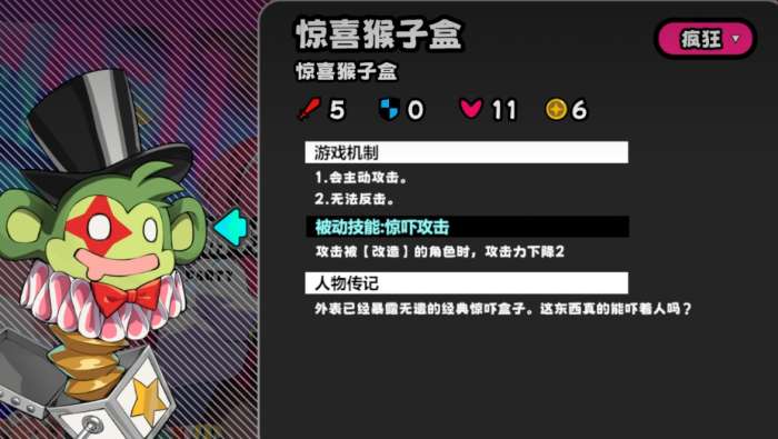 盒子是地图里最基础的怪物,不会反击,路过就能打。攻击有改造buff的角色后,还会降低两点攻击力。现在击杀怪物获得的星币数量,都直接标注在图鉴里了,方便计算收益。圆锯猴会反击,每三回合给六格范围内,没被改造的角色上三层改造buff。击杀圆锯猴会随机掉落一张糖果卡,这个收益还是挺不错的。