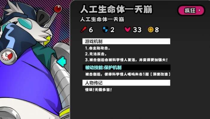 天崩不会反击,击杀后下个回合,会在boss那里复活成噩兆。进度条到4的时候,会固定刷新三个盒子和一只圆锯巨。噩兆出现的同时会触发事件,固定位置刷新一只圆锯猴和一只科学怪猿。科学怪猿会反击,攻击有改造buff的玩家,会增加三点攻击力。噩兆相比天崩多了反击能力,每两回合释放技能,对所有有改造buff的玩家,造成两点伤害并回复等量血量。