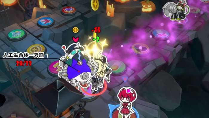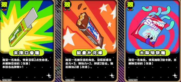 改造buff是这张图最关键的机制,角色身上有这个buff的话,每次自己行动结束,就会减少一层倒计时。当倒计时归零的时候角色会直接自爆死亡,伤害是按照当前血量计算的。听起来很危险,但其实有办法解决。地图中间有个新增的地块,路过可以花五星币抽卡,会随机给三种糖果卡牌中的一张。软糖和口香糖可以直接清除改造buff,士力架则是延长改造的持续时间。所以星币在这张图里非常重要,要多打盒子攒钱。