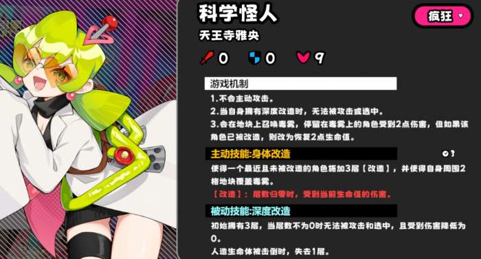 进入地图后,首先会在固定位置看到boss科学怪人雅央,旁边还有下级怪盒子,精英怪圆锯猴和人工生命体天崩。boss一开始打不动,身上挂着三层无敌buff,普通攻击完全无效。每击杀一次人工生命体才会去掉一层,所以前期的重点是处理这些生命体。boss每三回合会释放一次技能,给距离最近的没被改造的角色叠三层改造buff,然后以那个角色为中心五格范围产生持续一回合的毒雾。不过第一回合boss不会放技能,从第二回合才开始。
