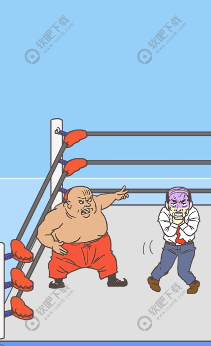 2、然后来到右边场景,将上司放到擂台上,给他戴上护臂后,上司会和哪个胖子打;