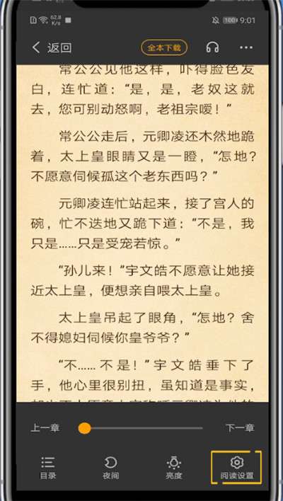3、点击小说屏幕中间调出阅读后台,点击右下角的阅读设置