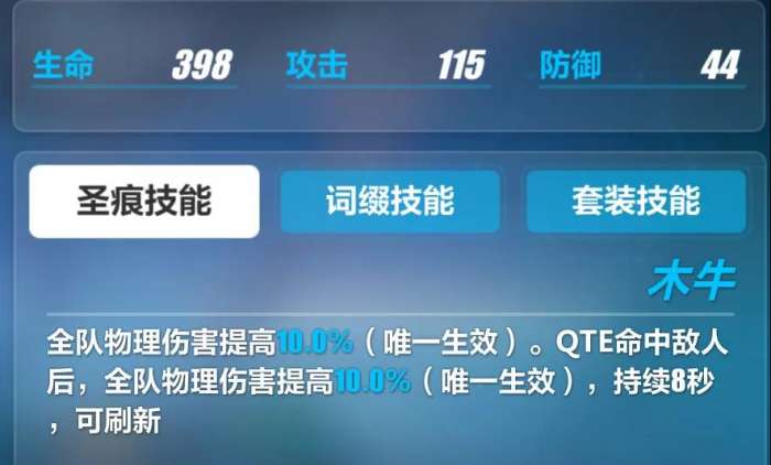 中位无辅助效果,主要用于凑3件套使用。由于观星本身比较类似于云墨,以提供辅助buff为主,同时自身进行一定的输出,中位为观星提供了物理加成及QTE破盾能力,自身QTE和大招倍率都比较可观,中位提供的加成可以为团队补充部分输出。