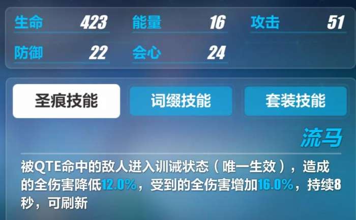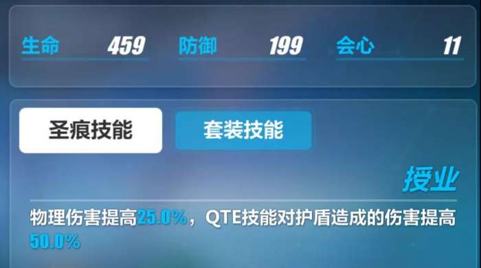下位为本套圣痕核心,可提供AOE效果的全易伤。触发条件为QTE命中敌人,QTE范围大的角色,更容易将buff覆盖到更多的目标。与观星相性极好。可成套也可单件使用。