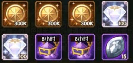 小宝箱:900K金币+200钻石+8小时粉尘*2+银瓜子*60+金瓜子*20+24小时英雄经验*2+480蓝色灵魂石。