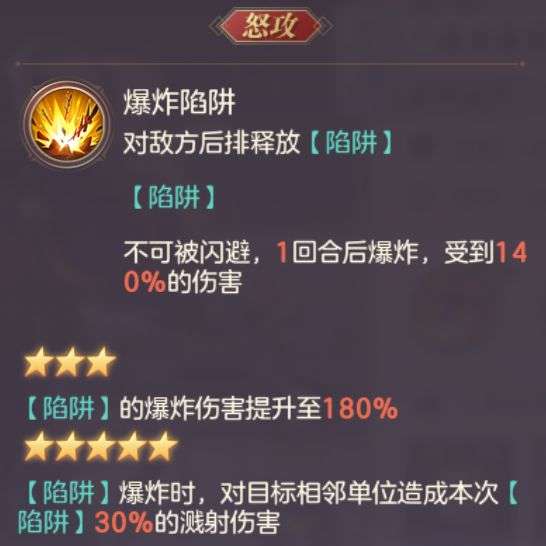 配上副属性加暴击率的战魂更是妙上加妙,4号位张郃的【陷阱】是一回合后爆炸。所以放在4号位可以更快进行【陷阱】的布置,能在保证安全的同时进行输出。