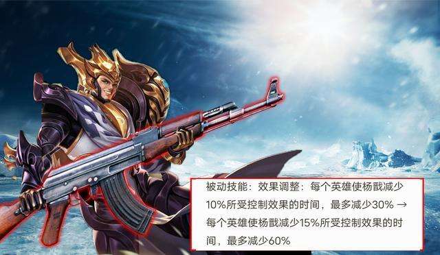 杨戬在7月13日更新中进行了加强,其被动韧性效果直接由10%~30%提升至20%~60%,也就意味着若他的周围有三名敌方英雄单位即可享受满韧性加持,几乎是控制不住的存在。故本次更新对于其被动进行了削弱,将每个敌人提升的韧性由20%下调至15%,也就意味着团战中需要周围有4个敌人,才可发挥杨戬的全部实力。虽小幅削弱,然而相比正式服而言还是强出了天际。