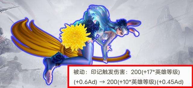 阿离于近期下调了二技能硬直时长,使得整体操作空间大幅上升,因此在17日和今天连续两次对其被动伤害进行了下调,虽初始伤害没受到影响,然而等级加成和AD加成均下滑明显,后期的阿离法伤会受到极大的遏制,中期发育速度也会受到一定影响。