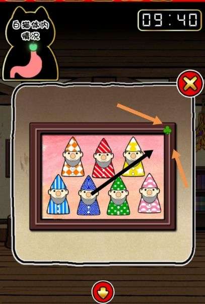 回到右侧小房间,将宝石的颜色更改为 上蓝,左右黄,下粉(爱心这个要选偏红的那个才是正确的p别问我为什么要提这个,因为我卡关了,而且我还以为苹果应该和左上角一致,是绿色的),正确喵!