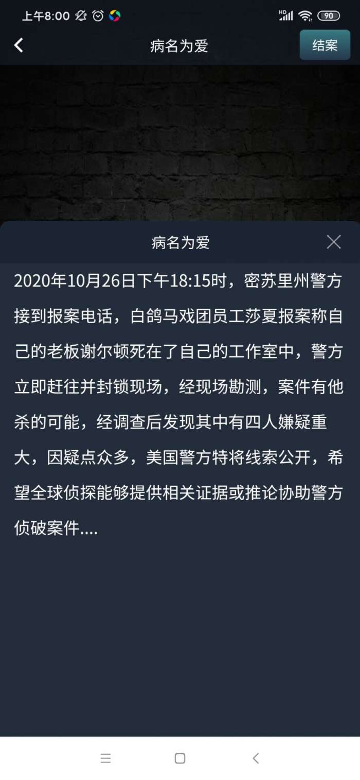 2020年10月26日下午18:15时,密苏里州警方接到报案电话,白鸽马戏团员工莎夏报案称自己的老板谢尔顿死在了自己的工作室中,警方立即赶往并封锁现场,经现场勘测,案件有他杀的可能,经调查后发现其中有四人嫌疑重大,因疑点众多,美国警方特将线索公开,希望全球侦探能够提供相关证据或推论协助警方侦破案件..